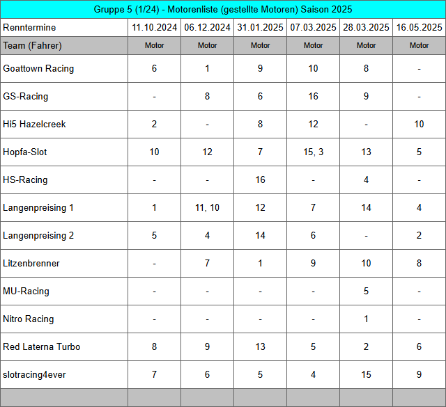 Gruppe 5 (1/24): Alle Rennergebnisse der Saison 2025 auf einen Blick.