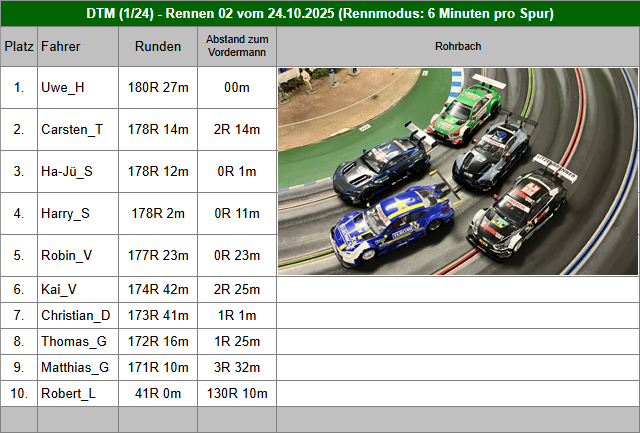Mit diesem ersten Rennen der neuen Saison in Rohrbach konnten wir die Grippverhältnisse auf der Bahn wieder stabilisieren. Im Qualifying durften Kai und Horst mit schlechtem Gripp vorlegen und sicherten, wie sich später herausstellte, mit 8,7er Rundenzeiten das Feld nach hinten ab. Ha-Jü und Robin hatten mit Rundenzeiten von 8,3 Sekunden die besten Resultate. Mit 8,5er Rundenzeiten gab es ein dicht besetztes Mittelfeld. Carlos, Carsten, Harry und Thomas waren hier mit von der Partie. Im Rennen starteten Ha-Jü und Robin im irren Zweikampf gegen Carlos und Carsten. Carlos kam nicht so recht in Schwung, konnte aber noch gut mithalten. Carsten war sehr schnell aber auch ab und zu neben der Spur unterwegs. Robin holte sich am Ende mit 8 Metern Vorsprung vor Ha-Jü den Sieg. In der zweiten Startgruppe fuhr Horst mit dem Einsatzfahrzeug von Kai und da sie beide gegeneinander fuhren, durfte sich Kai den sehr gut liegenden Audi von Robin ausleihen. Harry kämpfte auf mehreren Spuren mit fehlendem Gripp, konnte jedoch gegen Ende des Rennens auch mit Bestzeiten glänzen. Thomas konnte am Ende nur sehr knapp hinter Horst abschliessen. Mit extrem guten Runden hatte Kai bereits den Sieg im Auge, hatte das Fahrzeug jedoch dann am Ende aus strategischen Gründen und aus Respekt vor Robins Sieg, mitten zwischen Robin und Ha-Jü geparkt und die Restzeit ablaufen lassen.
