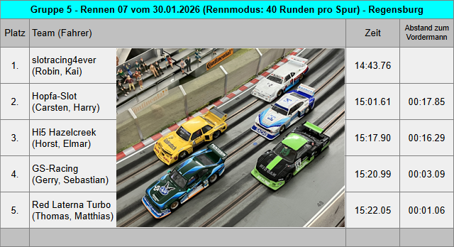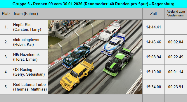 Mit den sechs Teams am heutigen Rennabend kamen insgesamt zwölf wunderschöne Gruppe 5 Fahrzeuge zum Renneinsatz. Da schlägt das Rennfahrerherz gleich mal höher. Bei der Fahrzeugabnahme gab es nur wenig Auffälligkeiten und alle Fahrzeuge entsprachen den Vorgaben aus dem Reglement. Bei einem Fahrzeug passte die Bodenfreiheit von 1,2mm hinten nur sehr knapp nicht und bei einem zweiten Fahrzeug passte die Reifenbreite hinten noch nicht ganz. Die Fahrer sind informiert und bessern das zum nächsten Rennabend nach. Für jedes Team wurden zwei Motoren ausgelost und dann jeweils in die zwei Einsatzfahrzeuge verbaut. Die Motorenliste 2026 findet man unterhalb der Teamwertung und auch für die vergangene Saison kann man die Motorenverteilung im Archiv 2025 der Gruppe 5 nachlesen. Das Qualifying musste mit dem Einsatzfahrzeug für den ersten Renndurchgang gefahren werden. Und so starteten aus der Qualifying Reihenfolge heraus GS-Racing, slotracing4ever, Hi5 Hazelcreek und Red Laterna Turbo in das erste Rennen mit sechs Minuten pro Spur. GS-Racing konnte sich nach kurzer Zeit bereits etwas von slotracing4ever nach vorn absetzen, wurde aber weiterhin gejagt. Hi5 Hazelcreek konnte den Speed aus dem Qualifying nicht so konstant umsetzen und fuhr erstmal ein schönes Rennen gegen Red Laterna Turbo. Team Litzenbrenner fuhr mit dem leider doch manchmal hoppelnden Leihwagen Ford von Kai in diesem Rennen etwas hinterher, konnte sich jedoch noch den letzten Podiumsplatz ergattern. Aus einer hinteren Position im Qualifying machte das Team Hopfa-Slot richtig Dampf und überholte im Fernduell noch das Team slotracing4ever. Spannung pur.
