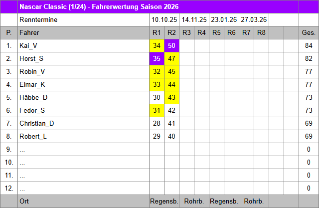 | Nascar Classic | Ergebnisse | Fahrerwertung | Reglement | ... |