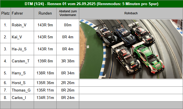 Mit diesem ersten Rennen der neuen Saison in Rohrbach konnten wir die Grippverhältnisse auf der Bahn wieder stabilisieren. Im Qualifying durften Kai und Horst mit schlechtem Gripp vorlegen und sicherten, wie sich später herausstellte, mit 8,7er Rundenzeiten das Feld nach hinten ab. Ha-Jü und Robin hatten mit Rundenzeiten von 8,3 Sekunden die besten Resultate. Mit 8,5er Rundenzeiten gab es ein dicht besetztes Mittelfeld. Carlos, Carsten, Harry und Thomas waren hier mit von der Partie. Im Rennen starteten Ha-Jü und Robin im irren Zweikampf gegen Carlos und Carsten. Carlos kam nicht so recht in Schwung, konnte aber noch gut mithalten. Carsten war sehr schnell aber auch ab und zu neben der Spur unterwegs. Robin holte sich am Ende mit 8 Metern Vorsprung vor Ha-Jü den Sieg. In der zweiten Startgruppe fuhr Horst mit dem Einsatzfahrzeug von Kai und da sie beide gegeneinander fuhren, durfte sich Kai den sehr gut liegenden Audi von Robin ausleihen. Harry kämpfte auf mehreren Spuren mit fehlendem Gripp, konnte jedoch gegen Ende des Rennens auch mit Bestzeiten glänzen. Thomas konnte am Ende nur sehr knapp hinter Horst abschliessen. Mit extrem guten Runden hatte Kai bereits den Sieg im Auge, hatte das Fahrzeug jedoch dann am Ende aus strategischen Gründen und aus Respekt vor Robins Sieg, mitten zwischen Robin und Ha-Jü geparkt und die Restzeit ablaufen lassen.