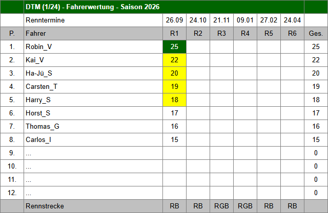 Von insgesamt sechs Rennen kommen in dieser Saison die besten fünf Rennen in die Wertung.