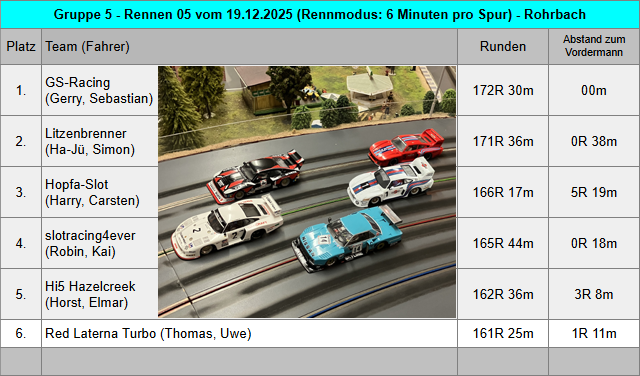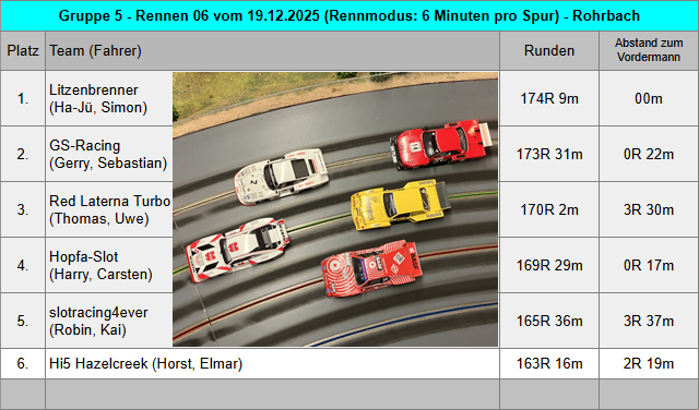 Mit den sechs Teams am heutigen Rennabend kamen insgesamt zwölf wunderschöne Gruppe 5 Fahrzeuge zum Renneinsatz. Da schlägt das Rennfahrerherz gleich mal höher. Bei der Fahrzeugabnahme gab es nur wenig Auffälligkeiten und alle Fahrzeuge entsprachen den Vorgaben aus dem Reglement. Bei einem Fahrzeug passte die Bodenfreiheit von 1,2mm hinten nur sehr knapp nicht und bei einem zweiten Fahrzeug passte die Reifenbreite hinten noch nicht ganz. Die Fahrer sind informiert und bessern das zum nächsten Rennabend nach. Für jedes Team wurden zwei Motoren ausgelost und dann jeweils in die zwei Einsatzfahrzeuge verbaut. Die Motorenliste 2026 findet man unterhalb der Teamwertung und auch für die vergangene Saison kann man die Motorenverteilung im Archiv 2025 der Gruppe 5 nachlesen. Das Qualifying musste mit dem Einsatzfahrzeug für den ersten Renndurchgang gefahren werden. Und so starteten aus der Qualifying Reihenfolge heraus GS-Racing, slotracing4ever, Hi5 Hazelcreek und Red Laterna Turbo in das erste Rennen mit sechs Minuten pro Spur. GS-Racing konnte sich nach kurzer Zeit bereits etwas von slotracing4ever nach vorn absetzen, wurde aber weiterhin gejagt. Hi5 Hazelcreek konnte den Speed aus dem Qualifying nicht so konstant umsetzen und fuhr erstmal ein schönes Rennen gegen Red Laterna Turbo. Team Litzenbrenner fuhr mit dem leider doch manchmal hoppelnden Leihwagen Ford von Kai in diesem Rennen etwas hinterher, konnte sich jedoch noch den letzten Podiumsplatz ergattern. Aus einer hinteren Position im Qualifying machte das Team Hopfa-Slot richtig Dampf und überholte im Fernduell noch das Team slotracing4ever. Spannung pur.