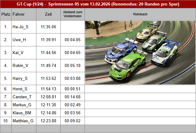 Nach etwa anderthalb Jahren Pause des GT-Cup in Regensburg konnten wir endlich mal wieder auf dem Hazelcreek-Speedway unsere Runden drehen. Mit zwölf Teilnehmern konnten wir exakt auf vier Startgruppen aufteilen. Ha-Jü, Kai und Uwe durften als erste in das Rennen starten. Dabei war es offensichtlich, dass Uwe irgendwie einen sehr hoch drehenden Motor im Fahrzeug hatte, denn er holte sich auf der Gegengeraden immer wieder zwei Fahrzeuglängen Vorsprung, die er allerdings in den Kurven innerhalb einer Runde wieder verlor. Trotzdem konnte er sich in diesem Sprint mit einer Sekunde Vorsprung erstmal den Sieg sichern. Robin, Thomas und Horst griffen dann in der zweiten Startgruppe an. Mit guten Rundenzeiten war Thomas immer an Robin dran, aber auch hier fehlte dann am Ende ebenfalls nur eine Sekunde. Horst beobachtete das Duell aus sicherer Entfernung, war aber auch nur etwa fünf Sekunden im Rückstand. Harry, Carsten und Elmar standen nun an der Startampel um die 20 Runden pro Spur zu absolvieren. Mit ausreichender Performance konnte sich Harry von den anderen beiden absetzen. Elmar gelang es, sich mit knapp über einer Sekunde den Platz vor Carsten zu sichern. Den Abschlussdurchgang im Sprintrennen fuhren Klaus, Jorge und Markus. Mit einem unauffällig schnellen Rennen beendete Jorge seine 60 Runden und holte sich den Gesamtsieg. Klaus setzte sich noch souverän vor Elmar und Markus sogar noch einen Wimpernschlag vor Harry.