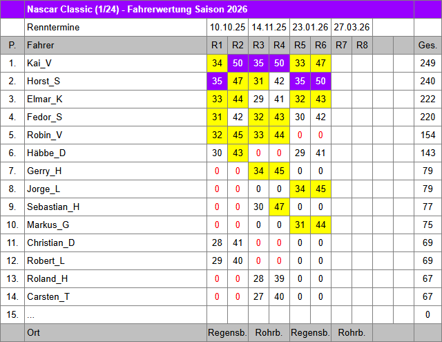 | Nascar Classic | Ergebnisse | Fahrerwertung | Reglement | ... |